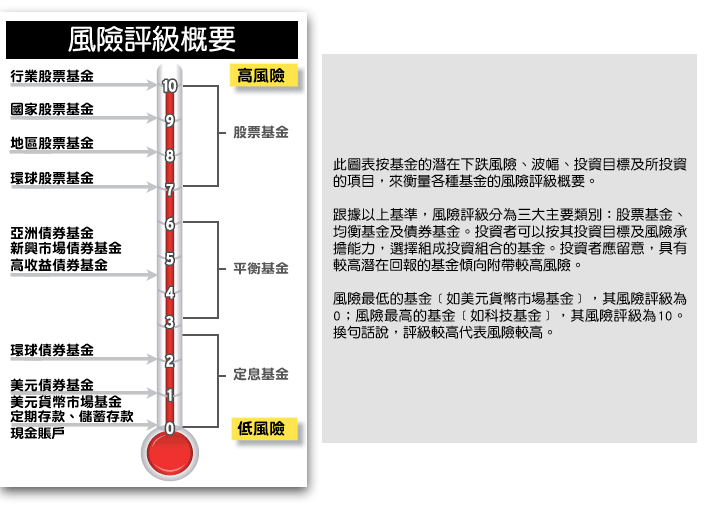 風險最低的基金﹝如美元貨幣市場基金﹞,其風險評級為0;風險最高的基金﹝如科技基金﹞,其風險評級為10。換句話說,評級較高代表風險較高。